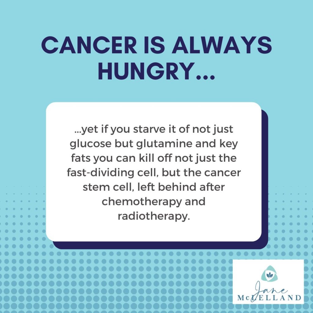 If eliminating sugar from the diet is a goal, I didn’t need to look any further than the ketogenic diet. The name comes from the process of eliminating/reducing the body’s primary fuel source, glucose, and forcing the body to convert to burning ketones for energy (source: Cleveland Clinic). There are additional benefits to this diet method. Switching to ketones also aids in the burning of fat cells. However, eliminating glucose from the diet only addresses one of the metabolic pathways. The traditional keto diet may not be sufficient to inhibit more than one pathway, as glutamine is another pathway that a tumor can utilize for survival. “Dietary sources of glutamine include plant and animal proteins such as beef, pork, poultry, milk, yogurt, ricotta cheese, cottage cheese, raw spinach, raw parsley, and cabbage” (source: Mount Sinai). Because meat, eggs, and dairy are high in glutamine, I decided to eliminate those foods from my diet as well. Thus, I began what I refer to as the Medi-Keto diet. Basically, a low-carb (no pasta) Mediterranean diet. The other pathways can also be affected metabolically and/or chemically, by using off-label medications as Jane McLelland did.